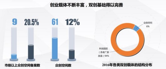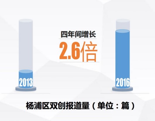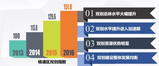 經(jīng)過指標(biāo)測算顯示,以2013年作為基期,楊浦區(qū)“雙創(chuàng)指數(shù)”從2013年的100(基期賦值)上升至2016年的151.0,增幅高達(dá)51%。其中,2016年較上年增長16.5%,成為歷年增速增長高的一年,雙創(chuàng)發(fā)展增速逐年提升。此外,各分項(xiàng)指數(shù)也均有提高,其中以雙創(chuàng)影響指數(shù)增長為強(qiáng)勁,從2013年的100增長到了2016年的153.1,較上年增長22.8%。“雙創(chuàng)影響力和成果的增幅比要素和環(huán)境明顯,這也表明,創(chuàng)新的要素和環(huán)境需要長時(shí)間的投入來改善,創(chuàng)新創(chuàng)業(yè)的發(fā)展需要積極進(jìn)取,還需要厚積薄發(fā)、沉得住氣。”楊浦區(qū)發(fā)改委張?zhí)鞜槺硎。?bào)告顯示,近年來?xiàng)钇謪^(qū)各類雙創(chuàng)載體面積(含老廠房改造)持續(xù)擴(kuò)大,截至2016年,楊浦區(qū)各類雙創(chuàng)載體面積已達(dá)到162.3萬平方米,其中,科技園區(qū)(含老廠房改造)面積占據(jù)各類雙創(chuàng)載體總面積的94.3%。同時(shí),如長陽創(chuàng)谷等園區(qū)的品牌效應(yīng)逐漸形成和擴(kuò)散,服務(wù)能級(jí)不斷提升。與此同時(shí),市級(jí)以上眾創(chuàng)空間備案數(shù)占上海比例呈逐年上升態(tài)勢(shì)。至2016年,楊浦已初步建成各類“眾創(chuàng)空間”61家,約占上海市總量的12%。其中,國家級(jí)眾創(chuàng)空間授牌為9家,占全市的20.5%;市級(jí)眾創(chuàng)空間授牌為16家,占全市的14%。
