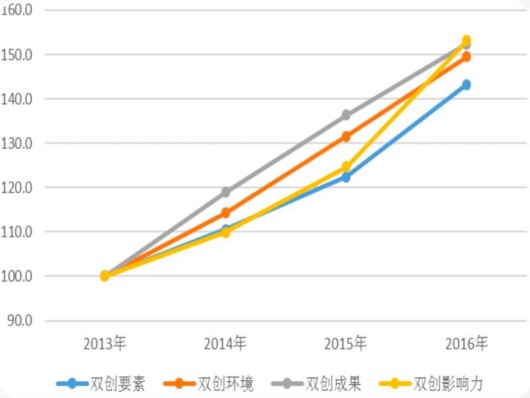 圖片說明:楊浦“雙創(chuàng)指數(shù)”4個(gè)一級(jí)指標(biāo)的逐年數(shù)據(jù)變化。