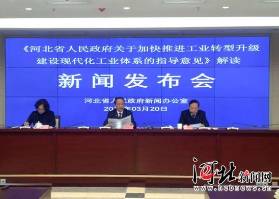 3月20日,河北省政府新聞辦召開新聞發(fā)布會,對《河北省人民政府關(guān)于加快推進(jìn)工業(yè)轉(zhuǎn)型升級建設(shè)現(xiàn)代化工業(yè)體系的指導(dǎo)意見》進(jìn)行解讀。圖為發(fā)布會現(xiàn)場。記者杜昱輝攝