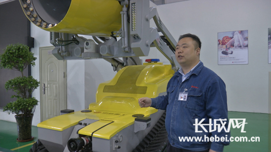 中信重工開誠智能裝備有限公司機(jī)器人研發(fā)部副經(jīng)理孫寧介紹全國首臺(tái)消防排煙滅火機(jī)器人。楊雨熹攝