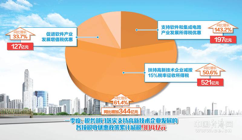 加快建設(shè)創(chuàng)新型國家是轉(zhuǎn)變經(jīng)濟發(fā)展方式、轉(zhuǎn)換經(jīng)濟增長動力的必然要求,也是建設(shè)現(xiàn)代化經(jīng)濟體系的重要措施。據(jù)國家稅務總局新統(tǒng)計,一季度稅務部門落實支持高新技術(shù)企業(yè)發(fā)展的各項稅收優(yōu)惠政策累計減稅904億元,同比增長61.4%。