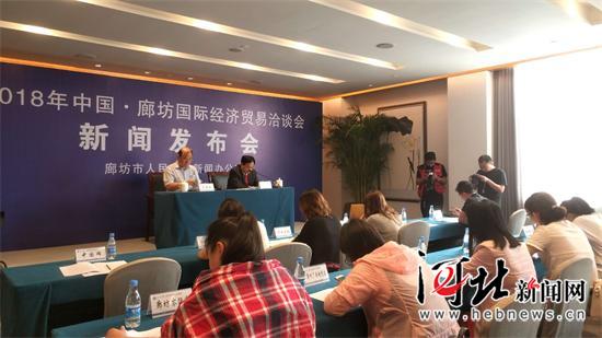 5月14日上午,2018年中國·廊坊國際經(jīng)濟(jì)貿(mào)易洽談會(huì)召開第二次新聞發(fā)布會(huì)。圖為會(huì)議現(xiàn)場。通訊員李松潔攝