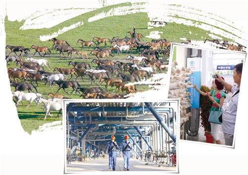 左上圖 馬的生產(chǎn)關(guān)鍵技術(shù)研究與示范項(xiàng)目是新疆“十二五”重大科技專(zhuān)項(xiàng),參與該項(xiàng)目的牧民獲益是原來(lái)收入的5倍以上。圖為新疆昭蘇馬場(chǎng)培育的馬群。(資料圖片)